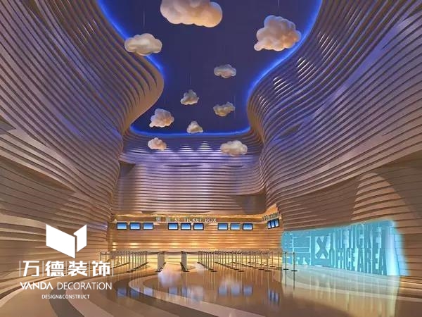 影院天花主要采用了冷光系的灯色,突显出烂漫而神秘的夜色氛围,演绎了一场关于光与色,冷与暖,现实与梦境的交融,有如舞台般绚烂,仿若在月光夜色悄然进行着精灵国度。